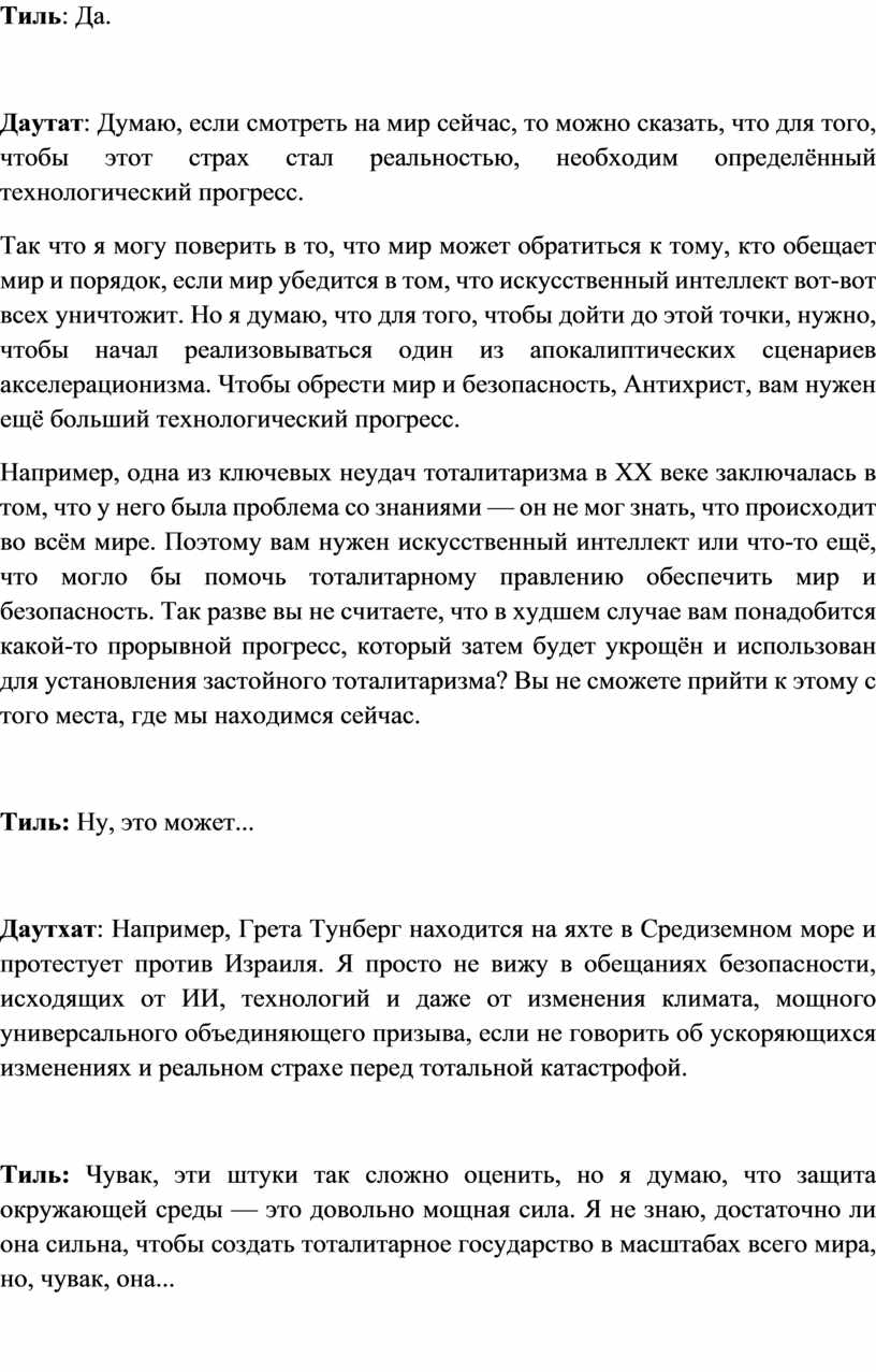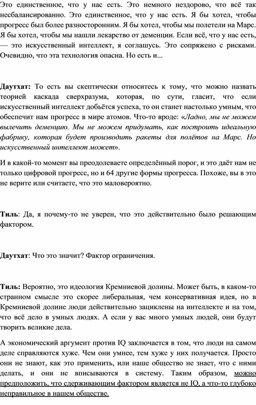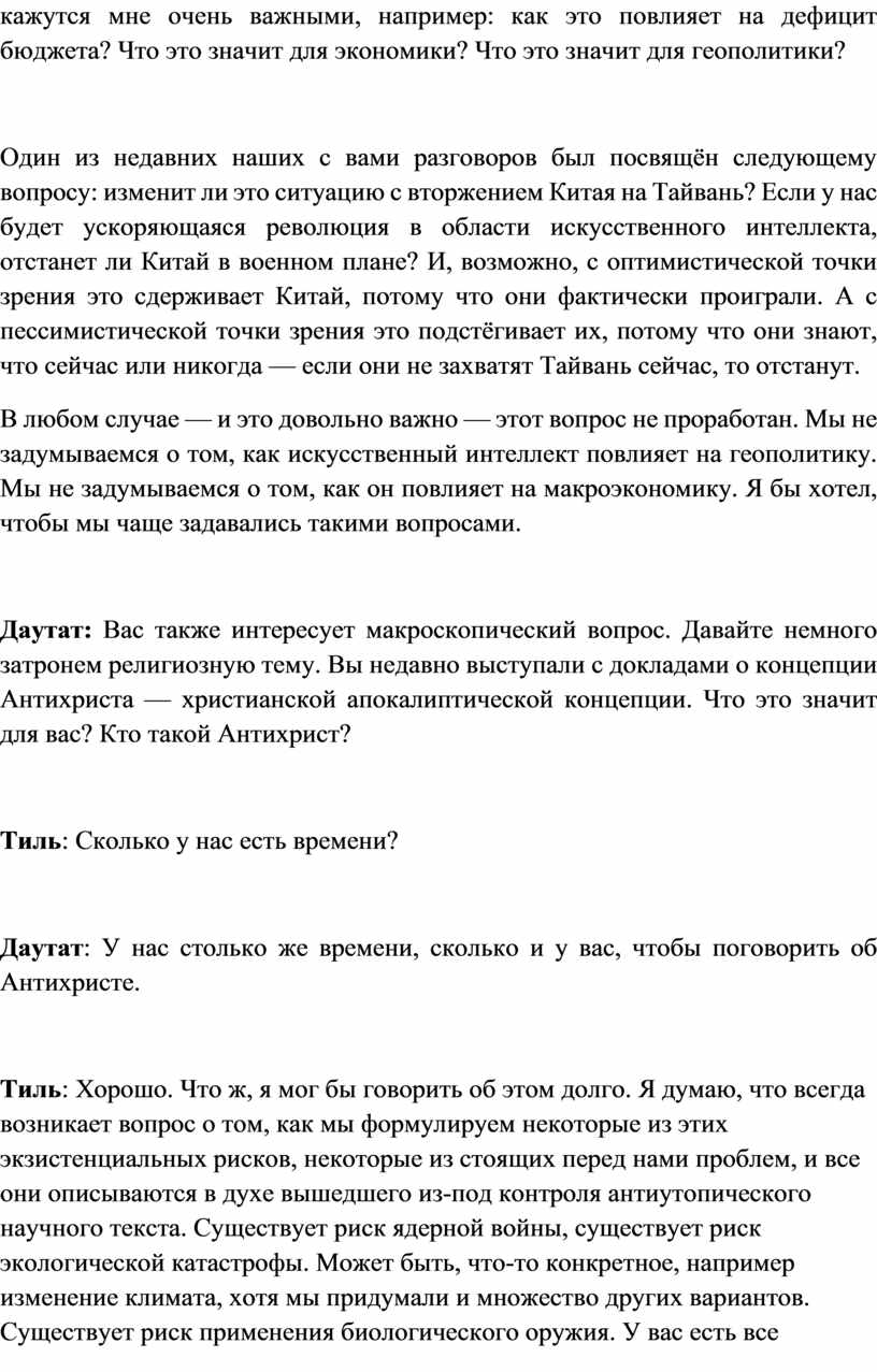 Тиль: Это — [вздыхает]. Вполне возможно. Это, конечно, риск. Но, думаю, в итоге я прихожу к следующему выводу: я по-прежнему считаю, что нам стоит попробовать искусственный интеллект, а альтернативой ему будет полная стагнация.