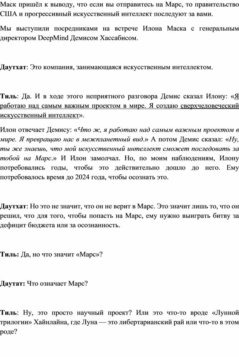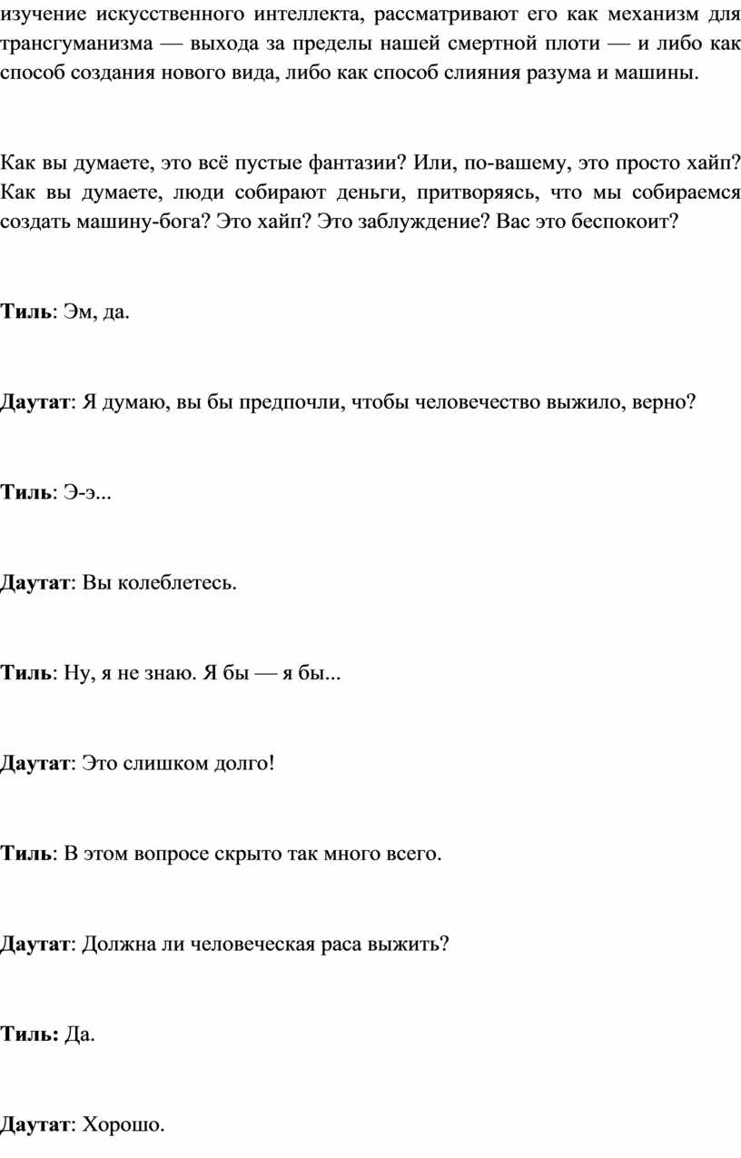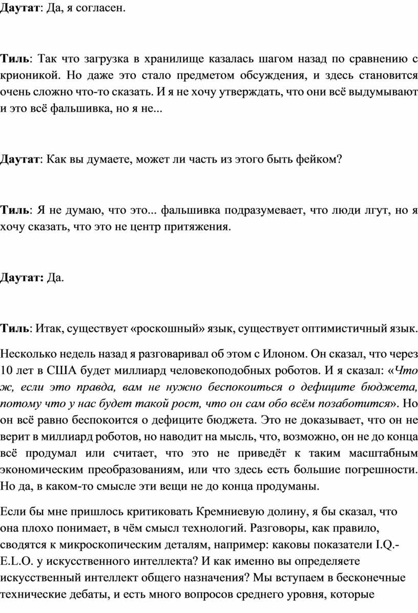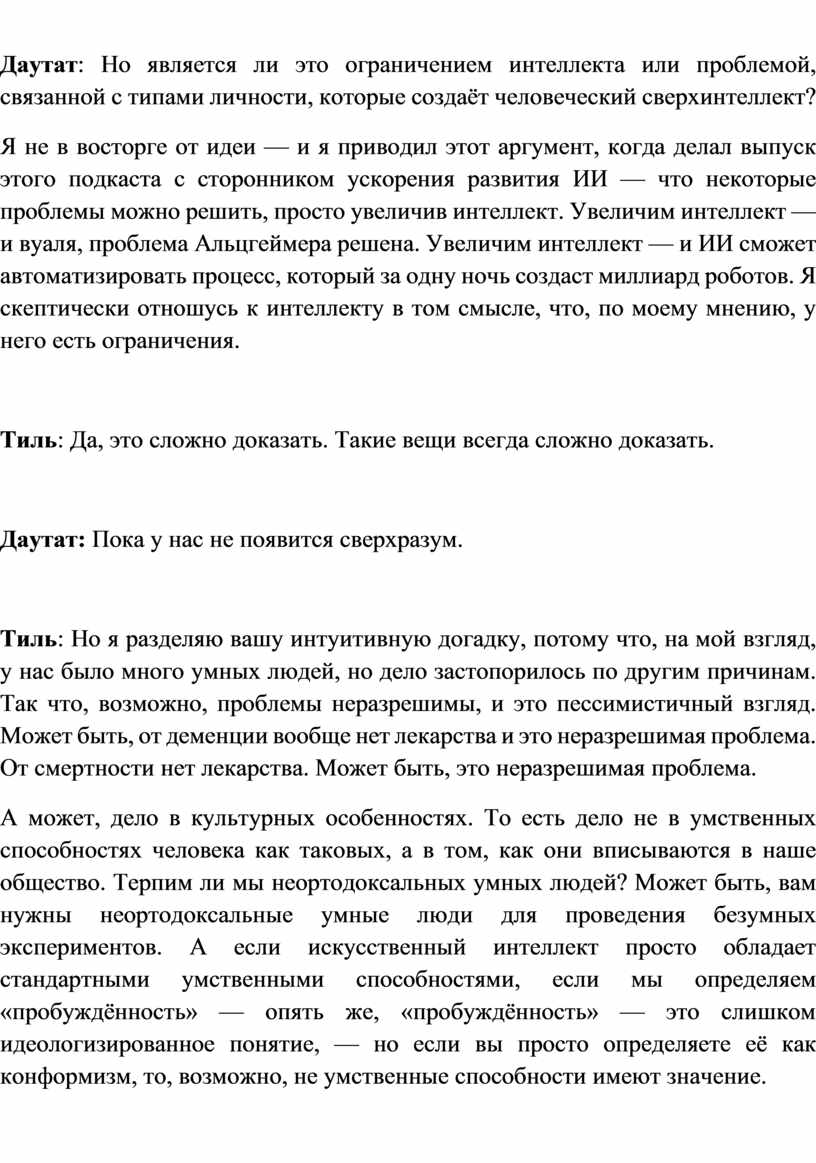 Тиль: Это — [вздыхает]. Вполне возможно. Это, конечно, риск. Но, думаю, в итоге я прихожу к следующему выводу: я по-прежнему считаю, что нам стоит попробовать искусственный интеллект, а альтернативой ему будет полная стагнация.