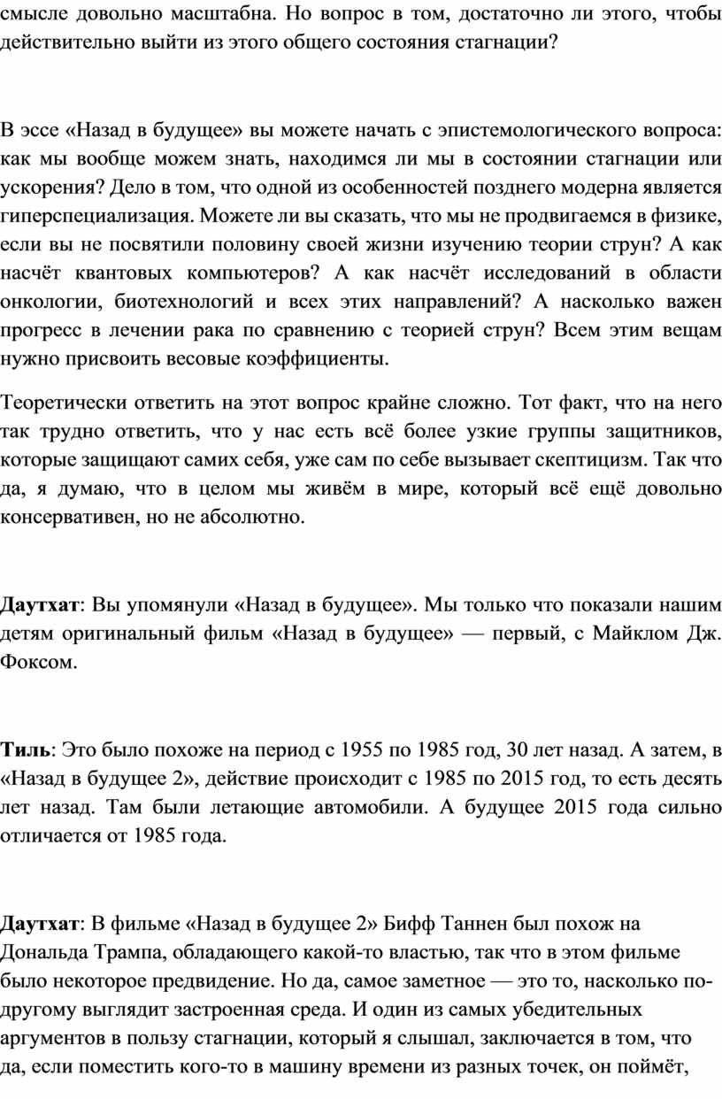 В эссе «Назад в будущее» вы можете начать с эпистемологического вопроса: как мы вообще можем знать, находимся ли мы в состоянии стагнации или ускорения? Дело в том, что одной из особенностей позднего модерна является гиперспециализация. Можете ли вы сказать, что мы не продвигаемся в физике, если вы не посвятили половину своей жизни изучению теории струн? А как насчёт квантовых компьютеров? А как насчёт исследований в области онкологии, биотехнологий и всех этих направлений? А насколько важен прогресс в лечении рака по сравнению с теорией струн? Всем этим вещам нужно присвоить весовые коэффициенты.
