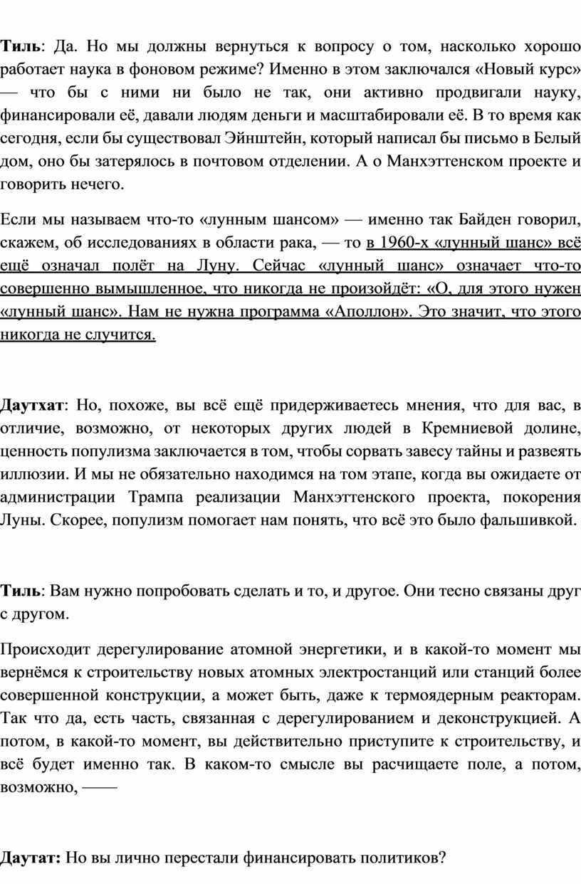 Даутхат: Но, похоже, вы всё ещё придерживаетесь мнения, что для вас, в отличие, возможно, от некоторых других людей в Кремниевой долине, ценность популизма заключается в том, чтобы сорвать завесу тайны и развеять иллюзии. И мы не обязательно находимся на том этапе, когда вы ожидаете от администрации Трампа реализации Манхэттенского проекта, покорения Луны. Скорее, популизм помогает нам понять, что всё это было фальшивкой.