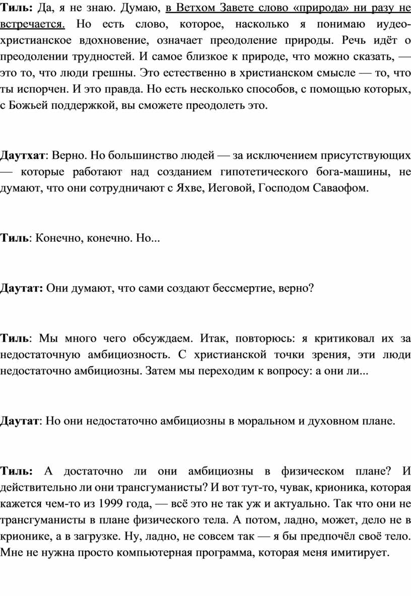 Тиль: Да, я не знаю. Думаю, в Ветхом Завете слово «природа» ни разу не встречается. Но есть слово, которое, насколько я понимаю иудео-христианское вдохновение, означает преодоление природы. Речь идёт о преодолении трудностей. И самое близкое к природе, что можно сказать, — это то, что люди грешны. Это естественно в христианском смысле — то, что ты испорчен. И это правда. Но есть несколько способов, с помощью которых, с Божьей поддержкой, вы сможете преодолеть это.