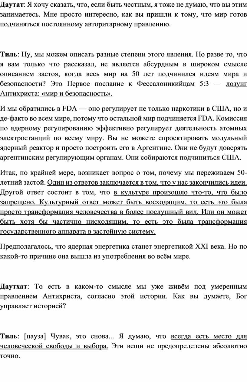 Тиль: Ну, мы можем описать разные степени этого явления. Но разве то, что я вам только что рассказал, не является абсурдным в широком смысле описанием застоя, когда весь мир на 50 лет подчинился идеям мира и безопасности? Это Первое послание к Фессалоникийцам 5:3 — лозунг Антихриста: «мир и безопасность».