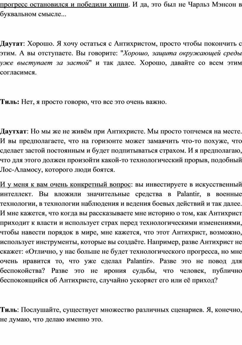 И у меня к вам очень конкретный вопрос: вы инвестируете в искусственный интеллект. Вы вложили значительные средства в Palantir, в военные технологии, в технологии наблюдения и ведения боевых действий и так далее. И мне кажется, что когда вы рассказываете мне историю о том, как Антихрист приходит к власти и использует страх перед технологическими изменениями, чтобы навести порядок в мире, мне кажется, что этот Антихрист, возможно, использует инструменты, которые вы создаёте. Например, разве Антихрист не скажет: «Отлично, у нас больше не будет технологического прогресса, но мне очень нравится то, что уже сделал Palantir». Разве это не повод для беспокойства? Разве это не ирония судьбы, что человек, публично беспокоящийся об Антихристе, случайно ускоряет его или её приход?