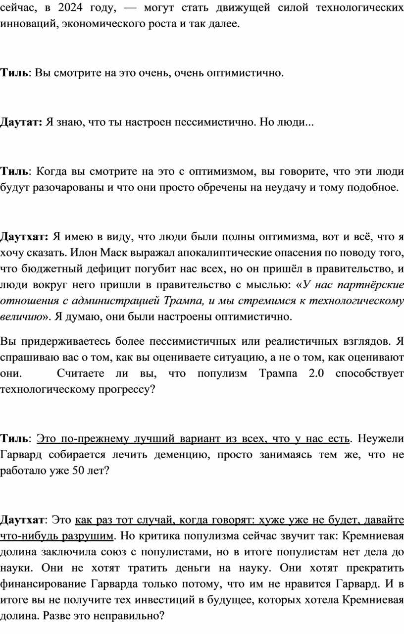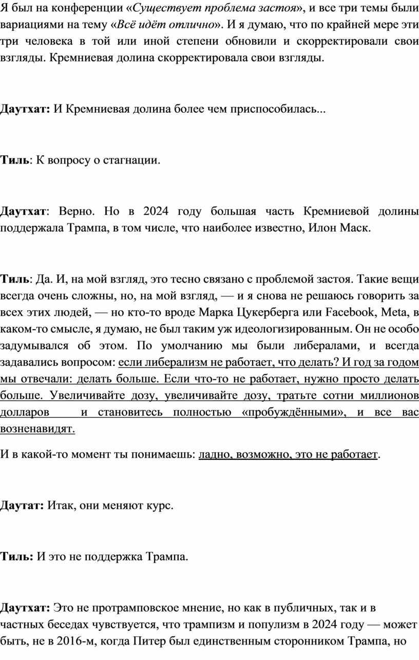 Даутхат: Это не протрамповское мнение, но как в публичных, так и в частных беседах чувствуется, что трампизм и популизм в 2024 году — может быть, не в 2016-м, когда Питер был единственным сторонником Трампа, но сейчас, в 2024 году, — могут стать движущей силой технологических инноваций, экономического роста и так далее.