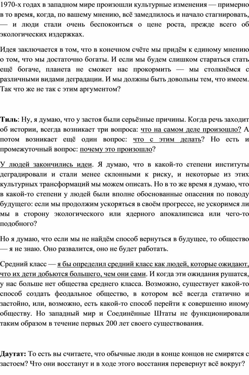 Даутат: Давайте остановимся на этом. Зачем нам нужен рост и динамизм? Потому что, как вы отметили в некоторых своих аргументах на эту тему, в 1970-х годах в западном мире произошли культурные изменения — примерно в то время, когда, по вашему мнению, всё замедлилось и начало стагнировать, — и люди стали очень беспокоиться о цене роста, прежде всего об экологических издержках.
