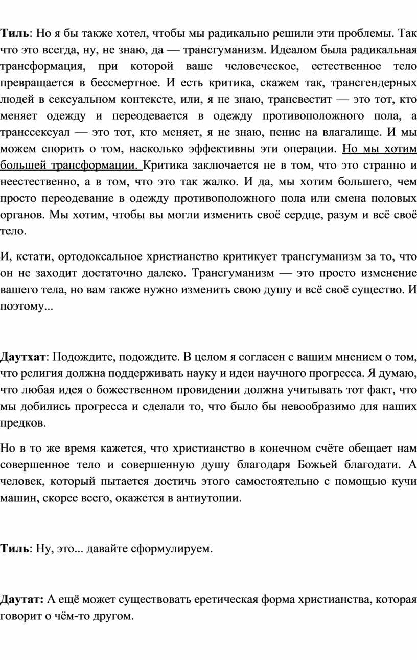 И, кстати, ортодоксальное христианство критикует трансгуманизм за то, что он не заходит достаточно далеко. Трансгуманизм — это просто изменение вашего тела, но вам также нужно изменить свою душу и всё своё существо. И поэтому...