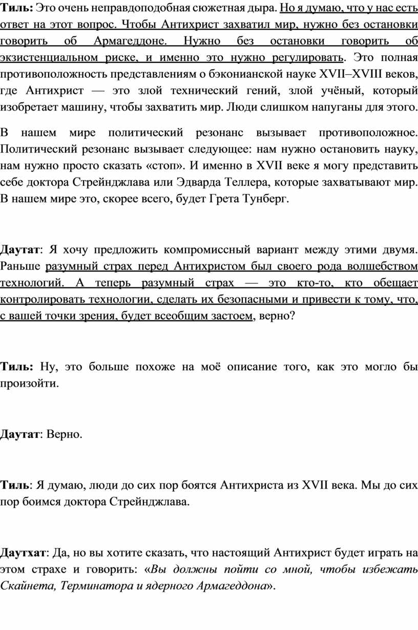 Тиль: Это очень неправдоподобная сюжетная дыра. Но я думаю, что у нас есть ответ на этот вопрос. Чтобы Антихрист захватил мир, нужно без остановки говорить об Армагеддоне. Нужно без остановки говорить об экзистенциальном риске, и именно это нужно регулировать. Это полная противоположность представлениям о бэконианской науке XVII–XVIII веков, где Антихрист — это злой технический гений, злой учёный, который изобретает машину, чтобы захватить мир. Люди слишком напуганы для этого.