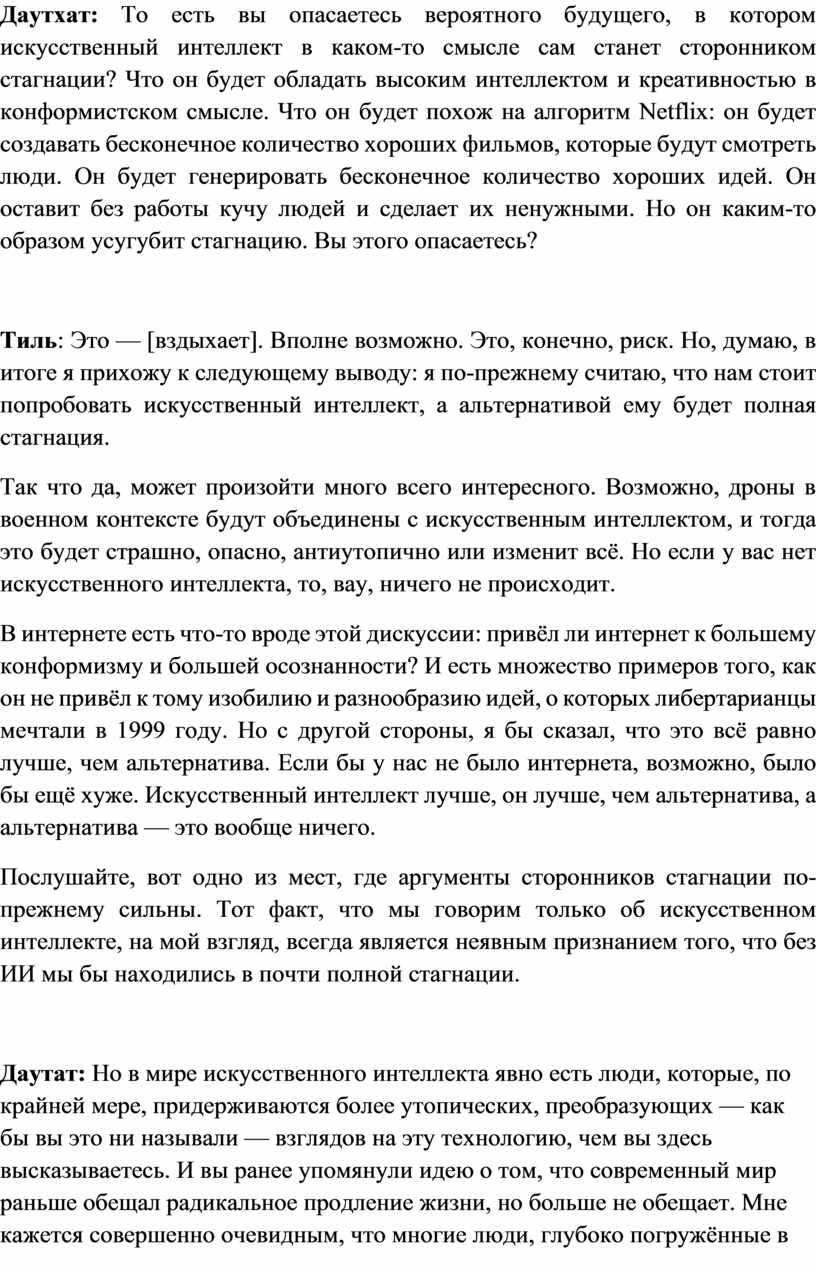 Даутхат: То есть вы опасаетесь вероятного будущего, в котором искусственный интеллект в каком-то смысле сам станет сторонником стагнации? Что он будет обладать высоким интеллектом и креативностью в конформистском смысле. Что он будет похож на алгоритм Netflix: он будет создавать бесконечное количество хороших фильмов, которые будут смотреть люди. Он будет генерировать бесконечное количество хороших идей. Он оставит без работы кучу людей и сделает их ненужными. Но он каким-то образом усугубит стагнацию. Вы этого опасаетесь?