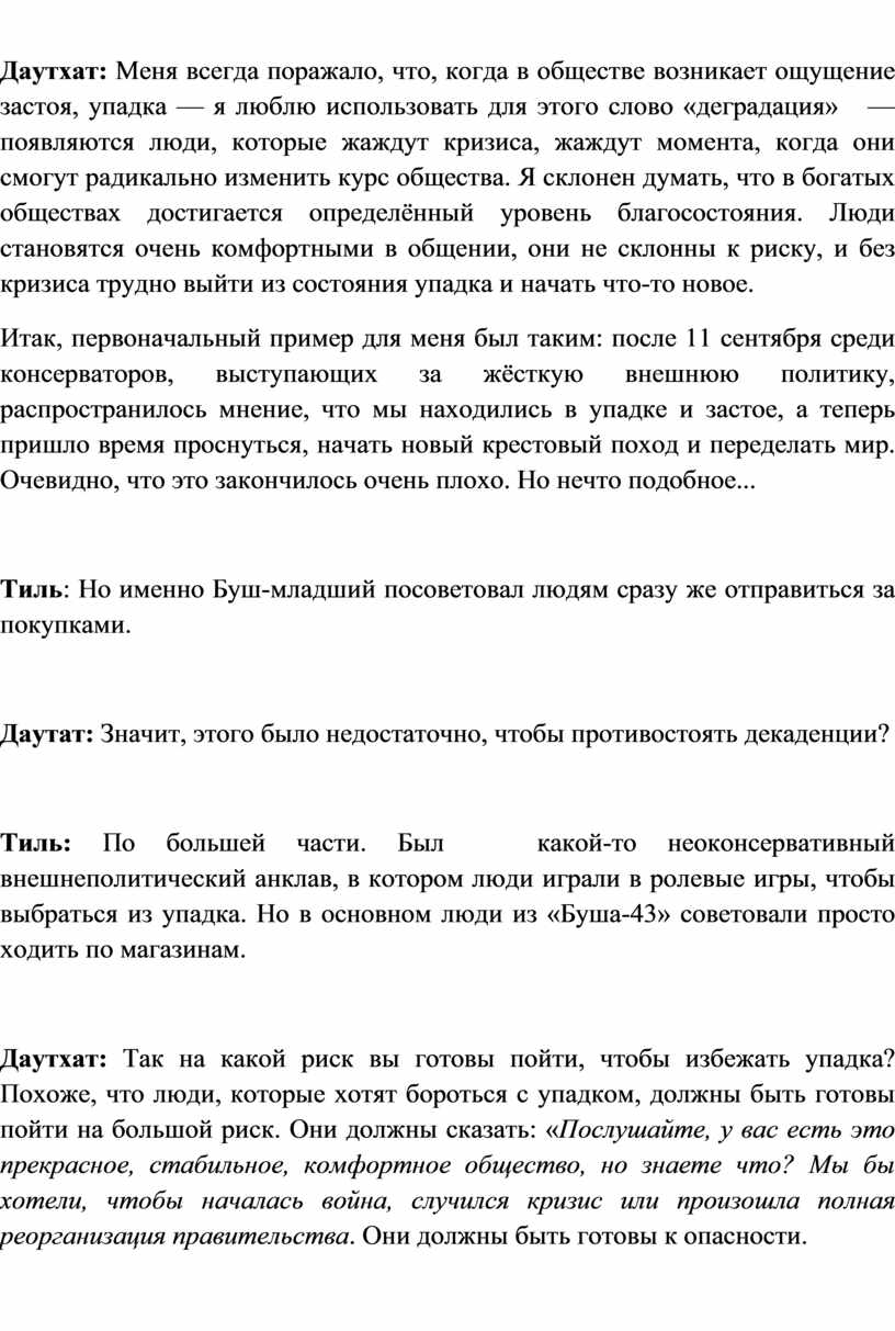 Даутхат: Так на какой риск вы готовы пойти, чтобы избежать упадка? Похоже, что люди, которые хотят бороться с упадком, должны быть готовы пойти на большой риск. Они должны сказать: «Послушайте, у вас есть это прекрасное, стабильное, комфортное общество, но знаете что? Мы бы хотели, чтобы началась война, случился кризис или произошла полная реорганизация правительства. Они должны быть готовы к опасности.