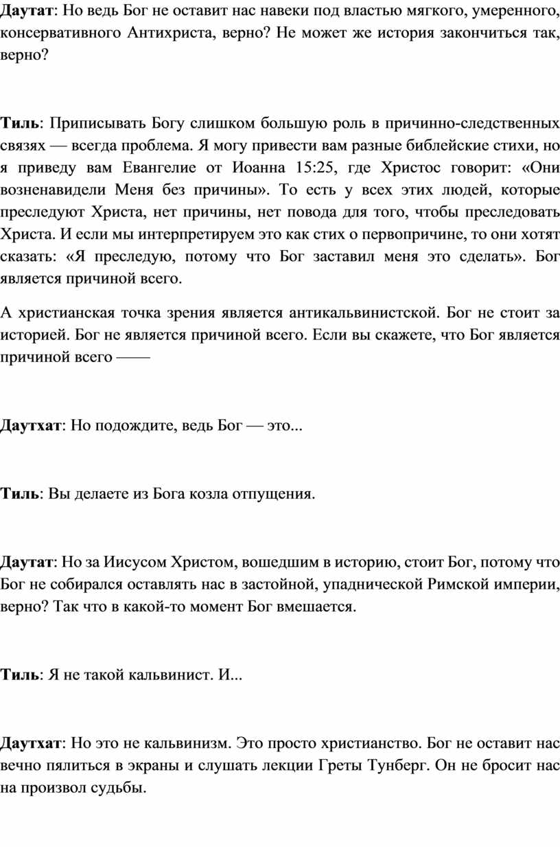 Даутхат: Но это не кальвинизм. Это просто христианство. Бог не оставит нас вечно пялиться в экраны и слушать лекции Греты Тунберг. Он не бросит нас на произвол судьбы.