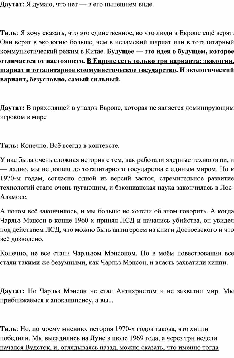 Тиль: Я хочу сказать, что это единственное, во что люди в Европе ещё верят. Они верят в экологию больше, чем в исламский шариат или в тоталитарный коммунистический режим в Китае. Будущее — это идея о будущем, которое отличается от настоящего. В Европе есть только три варианта: экология, шариат и тоталитарное коммунистическое государство. И экологический вариант, безусловно, самый сильный.