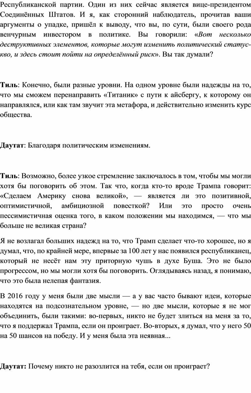 Тиль: Возможно, более узкое стремление заключалось в том, чтобы мы могли хотя бы поговорить об этом. Так что, когда кто-то вроде Трампа говорит: «Сделаем Америку снова великой», — является ли это позитивной, оптимистичной, амбициозной повесткой? Или это просто очень пессимистичная оценка того, в каком положении мы находимся, — что мы больше не великая страна?