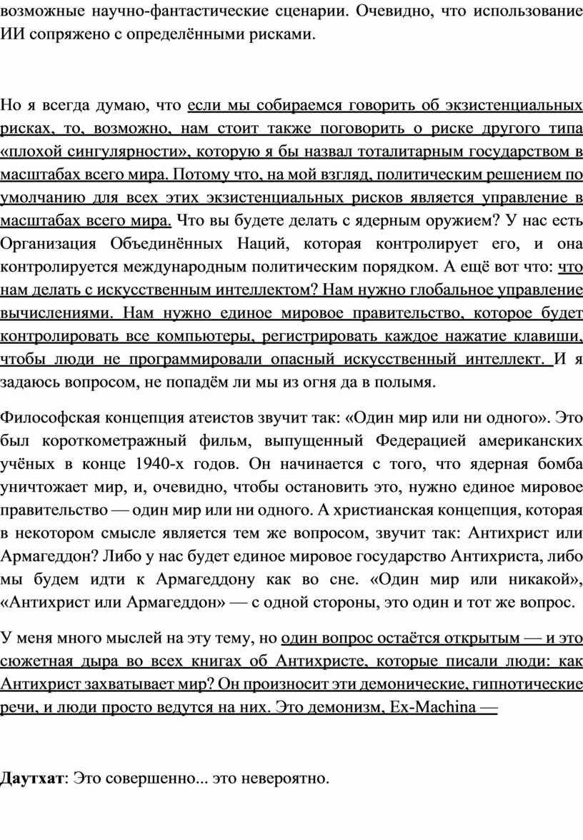 Даутхат: Да, но вы хотите сказать, что настоящий Антихрист будет играть на этом страхе и говорить: «Вы должны пойти со мной, чтобы избежать Скайнета, Терминатора и ядерного Армагеддона».