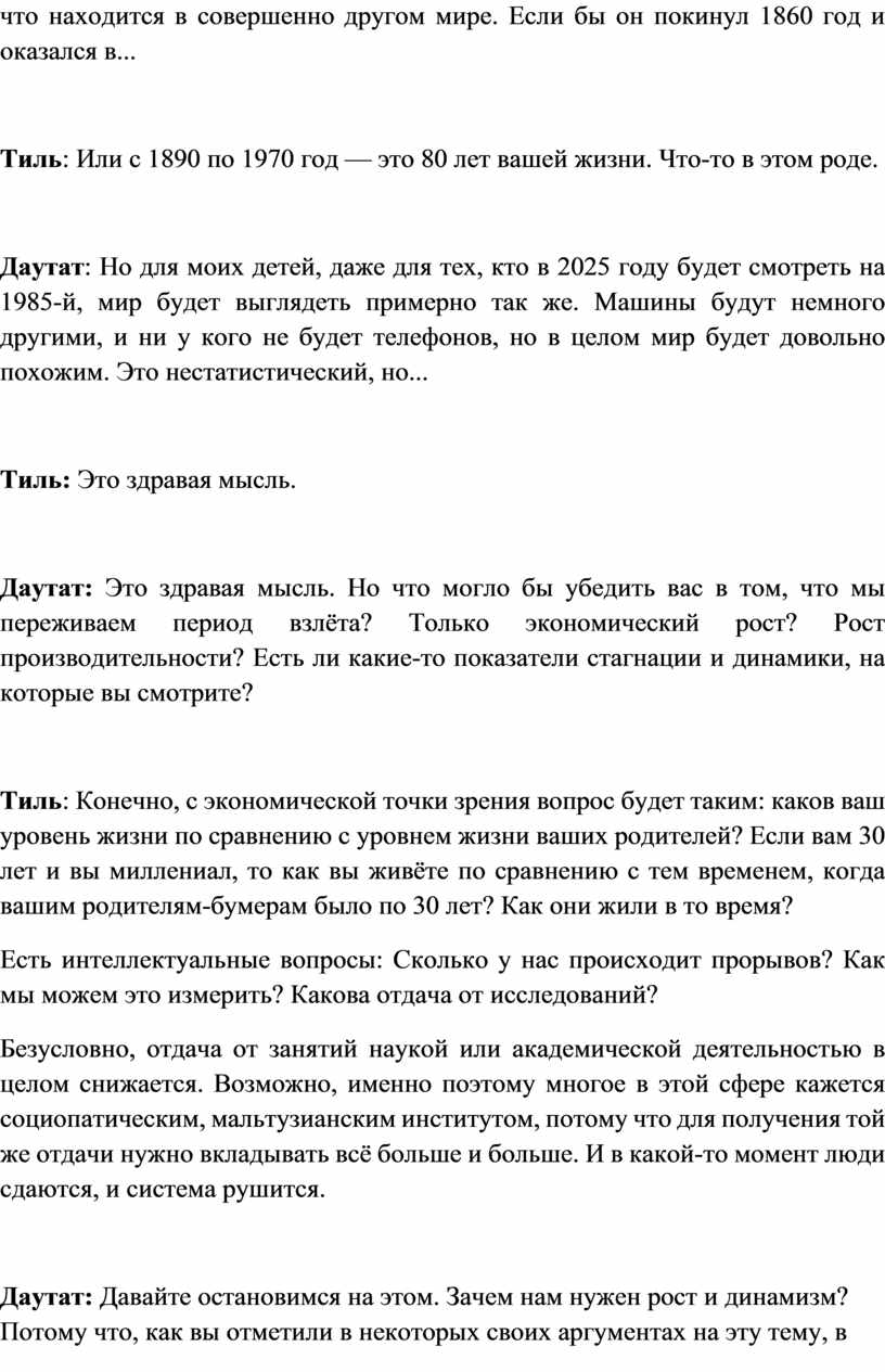 Даутат: Итак, я хочу начать с того, что перенесу вас в прошлое, примерно на 13 или 14 лет назад. Вы написали эссе для консервативного журнала National Review под названием «Конец будущего». По сути, в этом эссе утверждалось, что динамичный, быстро развивающийся, постоянно меняющийся современный мир не так динамичен, как кажется людям, и что на самом деле мы вступили в период технологического застоя. Эта цифровая жизнь была прорывом, но не таким масштабным, как надеялись люди, и мир, по сути, застрял на месте.