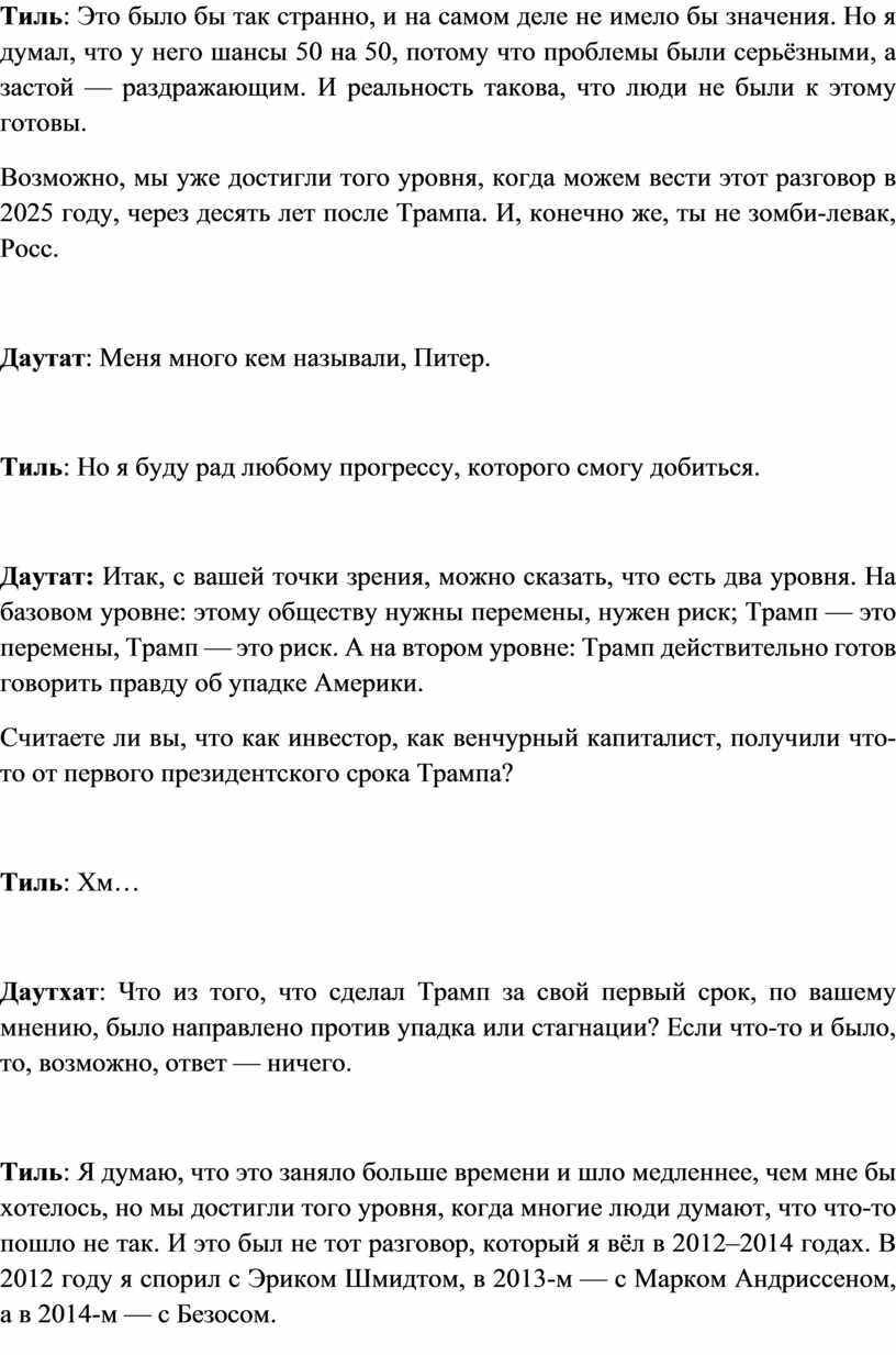 Тиль: Я думаю, что это заняло больше времени и шло медленнее, чем мне бы хотелось, но мы достигли того уровня, когда многие люди думают, что что-то пошло не так. И это был не тот разговор, который я вёл в 2012–2014 годах. В 2012 году я спорил с Эриком Шмидтом, в 2013-м — с Марком Андриссеном, а в 2014-м — с Безосом.