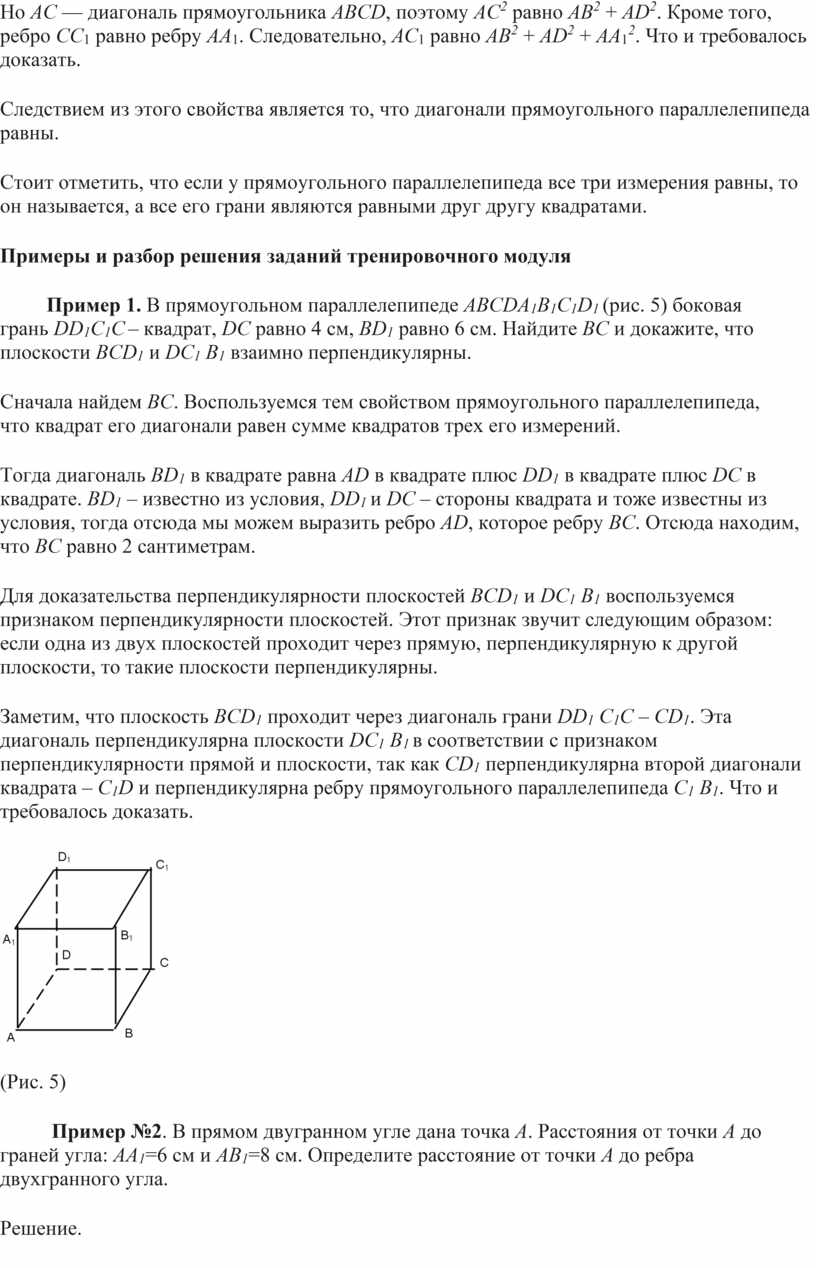 Пример 1. В прямоугольном параллелепипеде ABCDA1B1C1D1 (рис. 5) боковая грань DD1C1C – квадрат, DC равно 4 см, BD1 равно 6 см. Найдите BC и докажите, что плоскости BCD1 и DC1 B1 взаимно перпендикулярны.