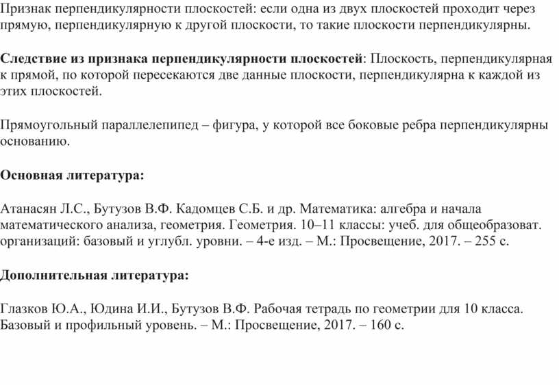 Атанасян Л.С., Бутузов В.Ф. Кадомцев С.Б. и др. Математика: алгебра и начала математического анализа, геометрия. Геометрия. 10–11 классы: учеб. для общеобразоват. организаций: базовый и углубл. уровни. – 4-е изд. – М.: Просвещение, 2017. – 255 с.