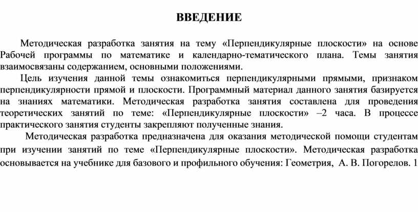 Методическая разработка предназначена для оказания методической помощи студентам при изучении занятий по теме «Перпендикулярные плоскости». Методическая разработка основывается на учебнике для базового и профильного обучения: Геометрия, А. В. Погорелов. 1