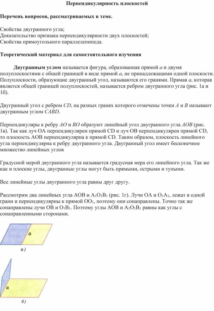 Перпендикуляры к ребру AO и BO образуют линейный угол двугранного угла AOB (рис. 1в). Так как луч ОА перпендикулярен прямой CD и луч OB перпендикулярен прямой CD, то плоскость АОВ перпендикулярна к прямой CD. Таким образом, плоскость линейного угла перпендикулярна к ребру двугранного угла. Двугранный угол имеет бесконечное множество линейных углов