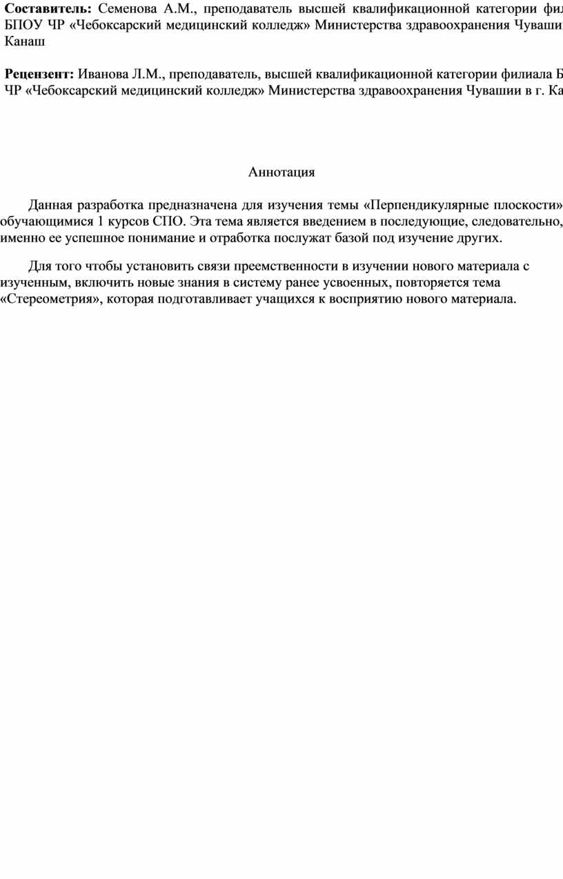 Рецензент: Иванова Л.М., преподаватель, высшей квалификационной категории филиала БПОУ ЧР «Чебоксарский медицинский колледж» Министерства здравоохранения Чувашии в г. Канаш
