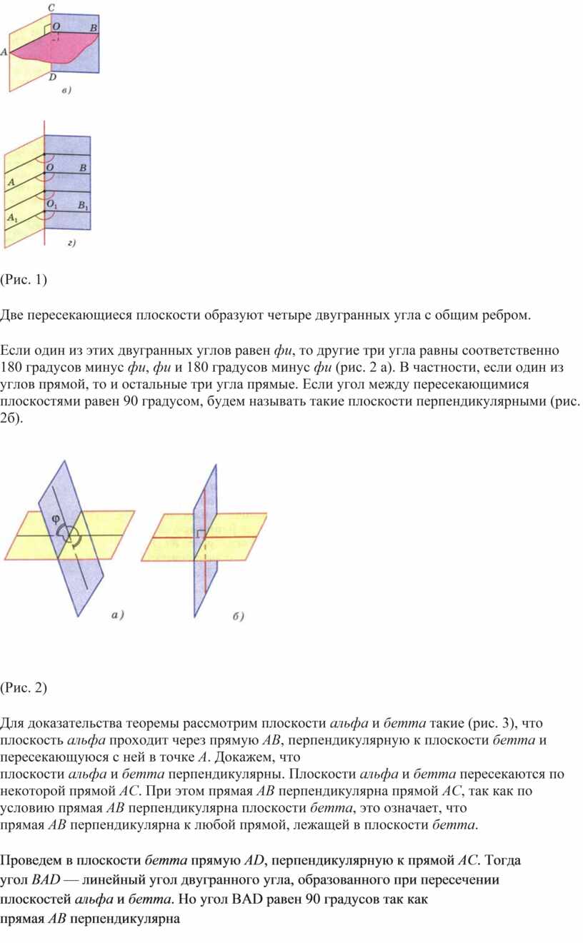 Если один из этих двугранных углов равен фи, то другие три угла равны соответственно 180 градусов минус фи, фи и 180 градусов минус фи (рис. 2 а). В частности, если один из углов прямой, то и остальные три угла прямые. Если угол между пересекающимися плоскостями равен 90 градусом, будем называть такие плоскости перпендикулярными (рис. 2б).