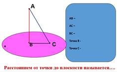 4. Первичное закрепление темы Дать определение первым трём отрезкам и указать название точек В и С (с целью 7.3.2.8 знать понятия перпендикуляра, наклонной и проекции наклонной;) Это задание выполняется устно, учащимися проговариваются определения перпендикуляра, наклонной и проекции наклонной.