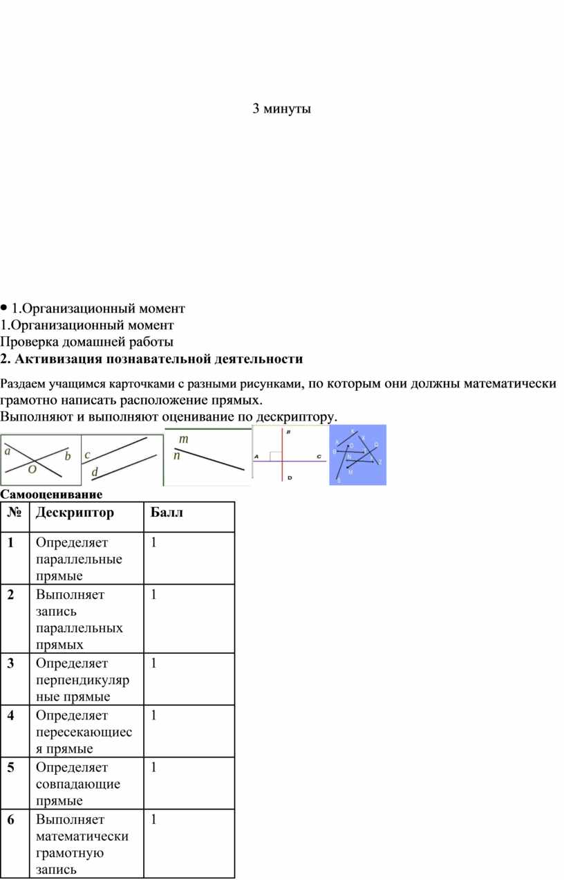 1.Организационный момент Проверка домашней работы 2. Активизация познавательной деятельности Раздаем учащимся карточками с разными рисунками, по которым они должны математически грамотно написать расположение прямых. Выполняют и выполняют оценивание по дескриптору.
