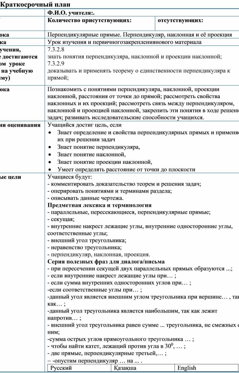 Учащиеся будут: - комментировать доказательство теорем и решения задач; - оперировать понятиями и терминами раздела; - описывать данные чертежа. Предметная лексика и терминология - параллельные, пересекающиеся, перпендикулярные прямые; - секущая; - внутренние накрест лежащие углы, внутренние односторонние углы, соответственные углы; - внешний угол треугольника; - неравенство треугольника; - перпендикуляр, наклонная, проекция. Серия полезных фраз для диалога/письма - при пересечении секущей двух параллельных прямых образуются ...; - если внутренние накрест лежащие углы при… ; - если сумма внутренних односторонних углов при… ; -если соответственные углы при… ; -данный угол является внешним углом треугольника при вершине… , так как… ; -данный угол треугольника является наибольшим, так как лежит напротив… ; - внешний угол треугольника равен сумме ... треугольника, не смежных с ним; -сумма острых углов прямоугольного треугольника … ; - чтобы найти катет, лежащий против угла в 300, … ; - две прямые, перпендикулярные третьей,… ; - -опустим перпендикуляр … на ... .