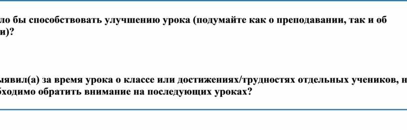 2: Что я выявил(а) за время урока о классе или достижениях/трудностях отдельных учеников, на что необходимо обратить внимание на последующих уроках?