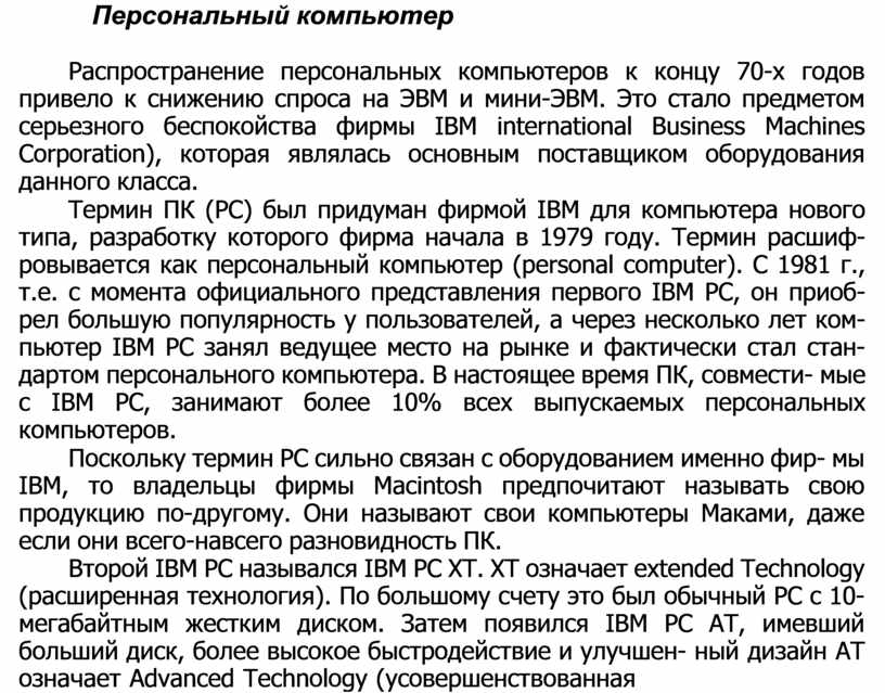 Термин ПК (PC) был придуман фирмой IBM для компьютера нового типа, разработку которого фирма начала в 1979 году. Термин расшиф- ровывается как персональный компьютер (personal computer). С 1981 г., т.е. с момента официального представления первого IBM PC, он приоб- рел большую популярность у пользователей, а через несколько лет ком- пьютер IBM PC занял ведущее место на рынке и фактически стал стан- дартом персонального компьютера. В настоящее время ПК, совмести- мые с IBM PC, занимают более 10% всех выпускаемых персональных компьютеров.