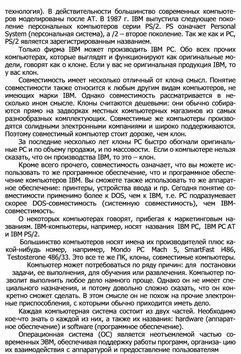 Кроме всего прочего, совместимость означает, что вы можете ис- пользовать то же программное обеспечение, что и программное обеспе- чение компьютеров IBM. Вы сможете также использовать то же аппарат- ное обеспечение: принтеры, устройства ввода и пр. Сегодня понятие со- вместимости применимо более к DOS, чем к IBM, т.е. PC подразумевает скорее DOS-совместимость (системную совместимость), чем IBM- совместимость.