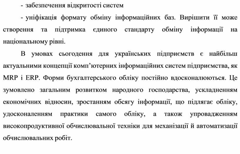 В умовах сьогодення для українських підприємств є найбільш актуальними концепції комп’ютерних інформаційних систем підприємства, як MRP і ERP. Форми бухгалтерського обліку постійно вдосконалюються. Це зумовлено загальним розвитком народного господарства, ускладненням економічних відносин, зростанням обсягу інформації, що підлягає обліку, удосконаленням практики самого обліку, а також упровадженням високопродуктивної обчислювальної техніки для механізації й автоматизації обчислювальних робіт.