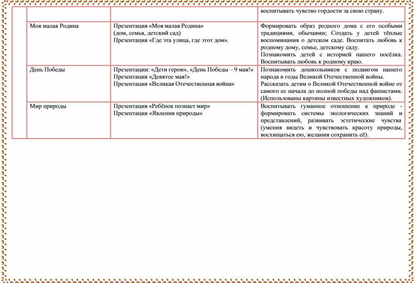 Формировать образ родного дома с его особыми традициями, обычаями; Создать у детей тёплые воспоминания о детском саде. Воспитать любовь к родному дому, семье, детскому саду. Познакомить детей с историей нашего посёлка. Воспитывать любовь к родному краю. |