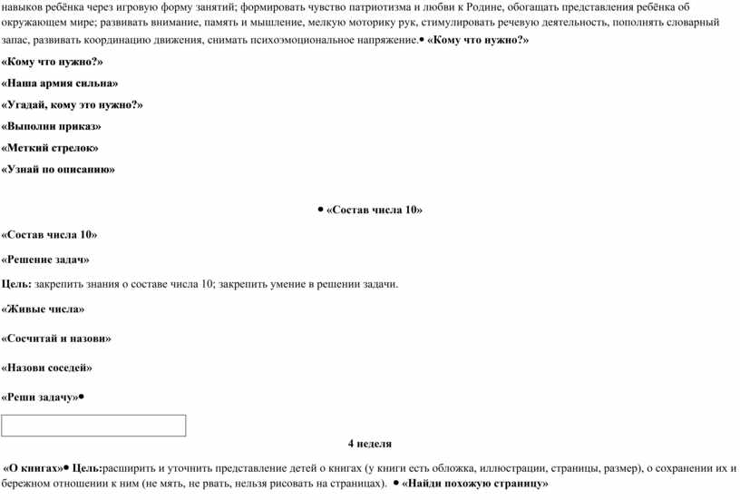Цель:развитие познавательных психических процессов, актуализация знаний, умений и навыков ребёнка через игровую форму занятий; формировать чувство патриотизма и любви к Родине, обогащать представления ребёнка об окружающем мире; развивать внимание, память и мышление, мелкую моторику рук, стимулировать речевую деятельность, пополнять словарный запас, развивать координацию движения, снимать психоэмоциональное напряжение. |