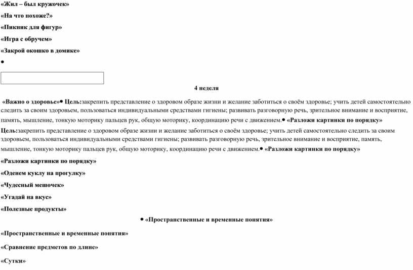 Цель: расширять представления о строении тела человека; знакомство с названиями частей тела и их назначением; знакомство с охраной здоровья и гигиеной тела, предметами гигиены; формирование навыка ориентировки в собственном теле, различения правой и левой руки, ноги и т. д