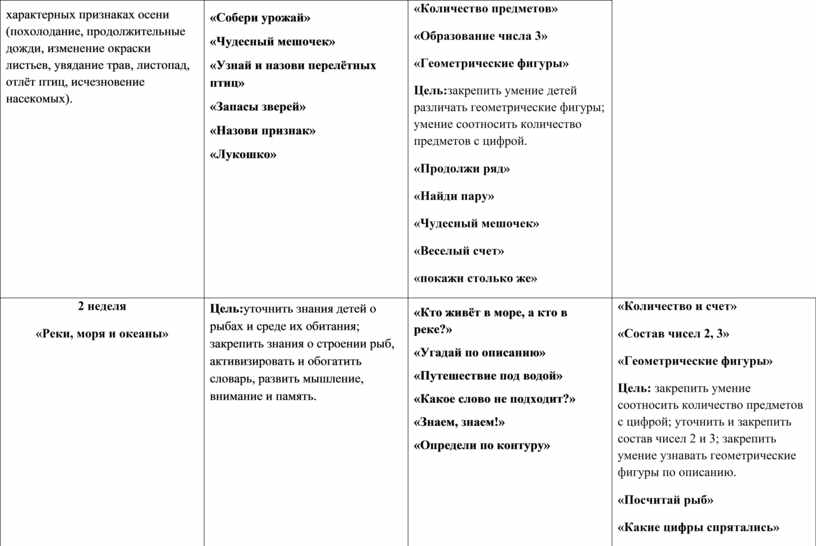 «Количество и счет» «Состав чисел 2, 3» «Геометрические фигуры» Цель: закрепить умение соотносить количество предметов с цифрой; уточнить и закрепить состав чисел 2 и 3; закрепить умение узнавать геометрические фигуры по описанию. «Посчитай рыб» «Какие цифры спрятались» «Чем похожи и чем отличаются фигуры» |
