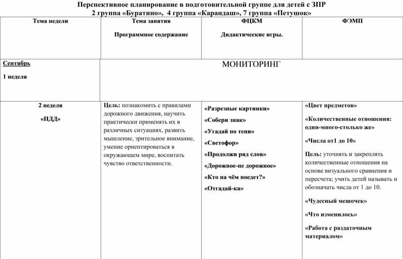 Перспективное планирование в подготовительной группе для детей с ЗПР