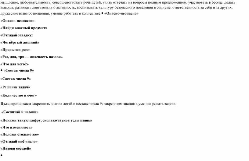 «Опасно-неопасно» «Найди опасный предмет» «Отгадай загадку» «Четвёртый лишний» «Продолжи ряд» «Раз, два, три — опасность назови» «Что для чего?»