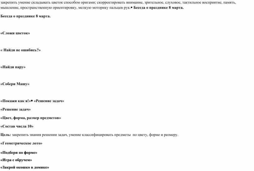 Цель:закрепить знания детей о женском празднике; уточнить и закрепить представления детей о женском празднике; актуализировать словарный запас по теме; закрепить в речи словарь признаков, глагольный словарь; закрепить умение складывать цветок способом оригами; скорректировать внимание, зрительное, слуховое, тактильное восприятие, память, мышление, пространственную ориентировку, мелкую моторику пальцев рук. |