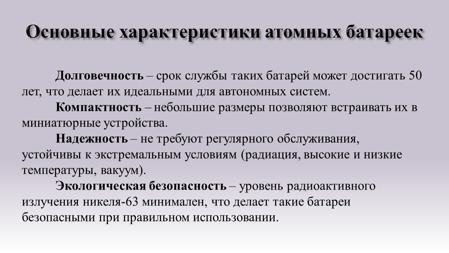 Основные характеристики атомных батареек