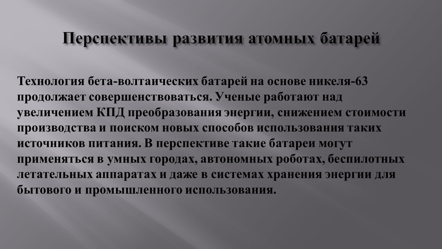 Технология бета-волтаических батарей на основе никеля-63 продолжает совершенствоваться. Ученые работают над увеличением КПД преобразования энергии, снижением стоимости производства и поиском новых способов использования таких источников питания. В перспективе такие батареи могут применяться в умных городах, автономных роботах, беспилотных летательных аппаратах и даже в системах хранения энергии для бытового и промышленного использования.