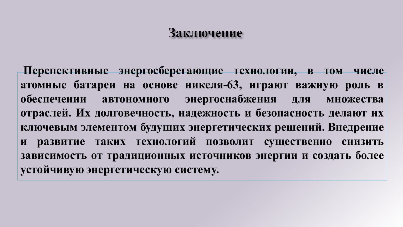 Перспективные энергосберегающие технологии, в том числе атомные батареи на основе никеля-63, играют важную роль в обеспечении автономного энергоснабжения для множества отраслей. Их долговечность, надежность и безопасность делают их ключевым элементом будущих энергетических решений. Внедрение и развитие таких технологий позволит существенно снизить зависимость от традиционных источников энергии и создать более устойчивую энергетическую систему.