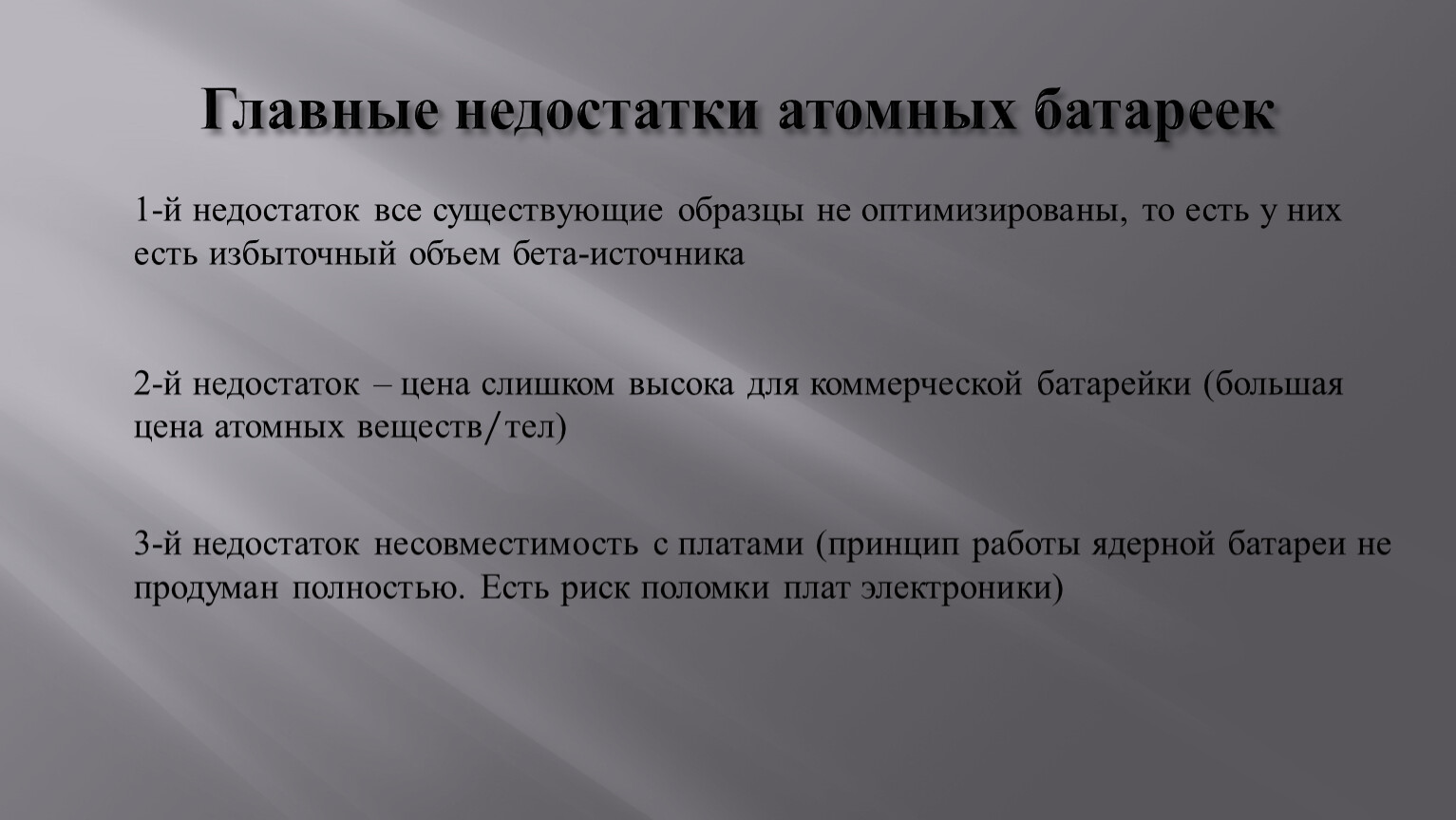 3-й недостаток несовместимость с платами (принцип работы ядерной батареи не продуман полностью. Есть риск поломки плат электроники)