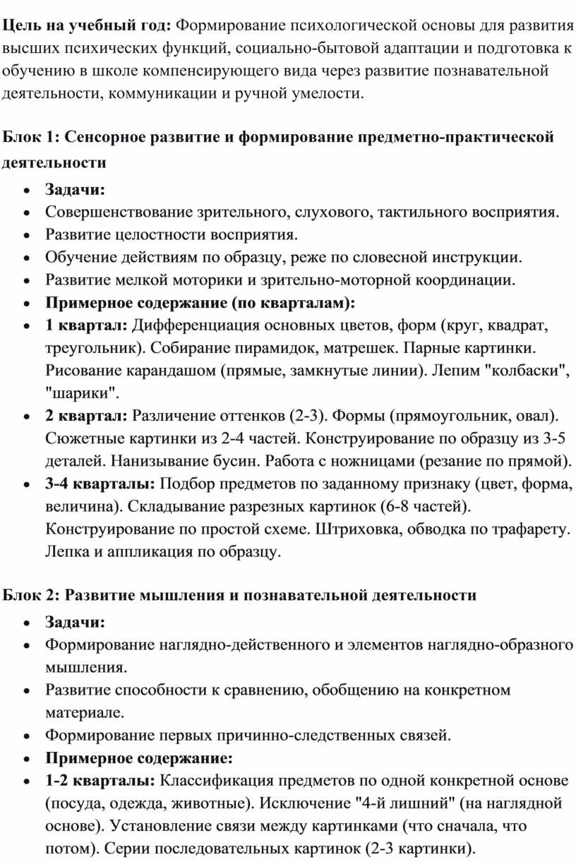Цель на учебный год: Формирование психологической основы для развития высших психических функций, социально-бытовой адаптации и подготовка к обучению в школе компенсирующего вида через развитие познавательной деятельности, коммуникации и ручной умелости.