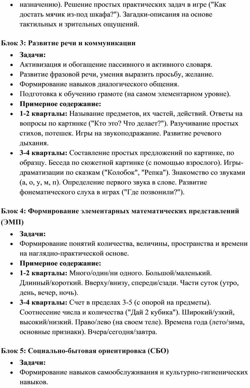 · 1-2 кварталы: Называние предметов, их частей, действий. Ответы на вопросы по картинке ("Кто это? Что делает?"). Разучивание простых стихов, потешек. Игры на звукоподражание. Развитие речевого дыхания.