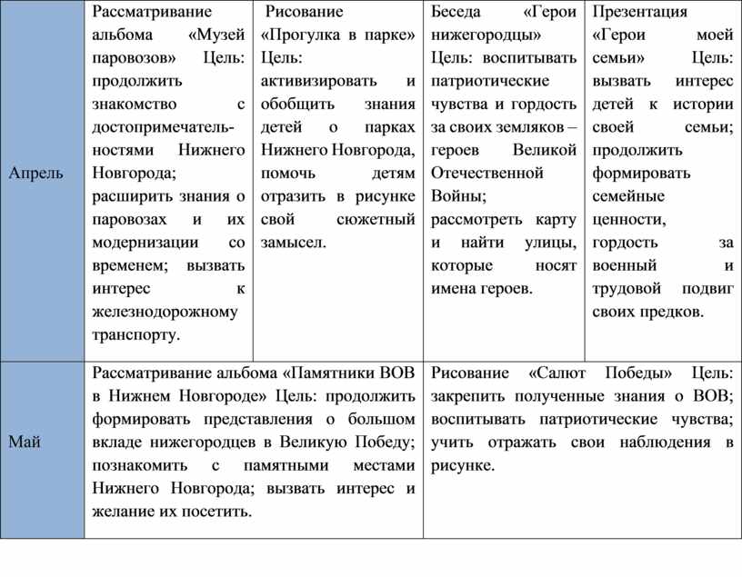 Рассматривание альбома «Памятники ВОВ в Нижнем Новгороде» Цель: продолжить формировать представления о большом вкладе нижегородцев в Великую Победу; познакомить с памятными местами Нижнего Новгорода; вызвать интерес и желание их посетить. |