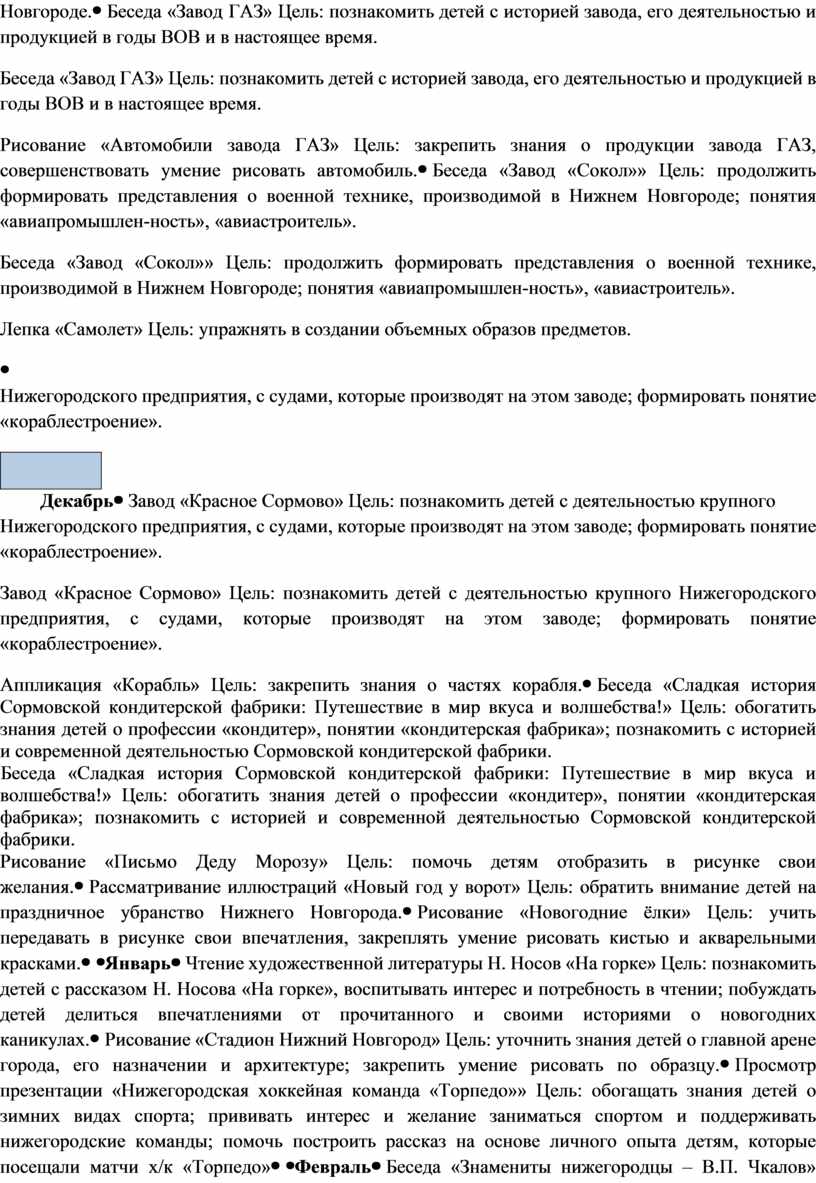 Беседа «Завод ГАЗ» Цель: познакомить детей с историей завода, его деятельностью и продукцией в годы ВОВ и в настоящее время. Рисование «Автомобили завода ГАЗ» Цель: закрепить знания о продукции завода ГАЗ, совершенствовать умение рисовать автомобиль. |