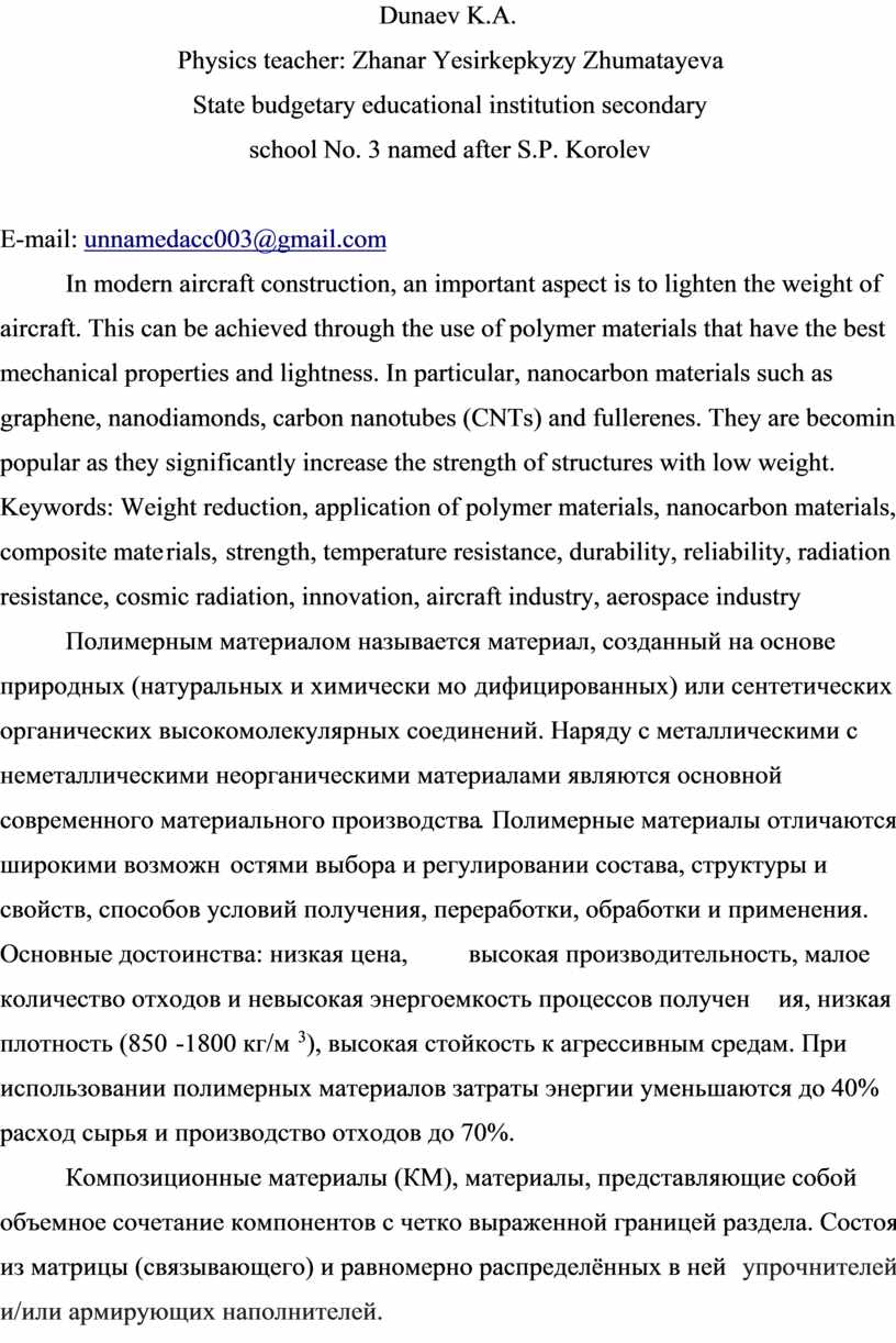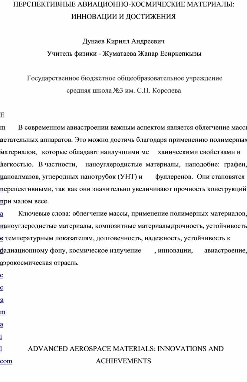 Ключевые слова: облегчение массы, применение полимерных материалов, наноуглеродистые материалы, композитные материалы, прочность, устойчивость к температурным показателям, долговечность, надежность, устойчивость к радиационному фону, космическое излучение, инновации, авиастроение, аэрокосмическая отрасль.