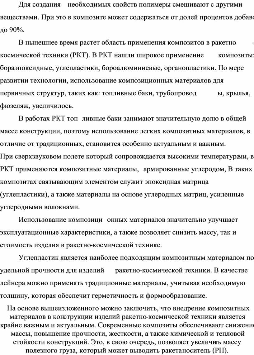 В нынешнее время растет область применения композитов в ракетно-космической техники (РКТ). В РКТ нашли широкое применение композиты: бораэпоксидные, углепластики, бороалюминиевые, органопластики. По мере развитии технологии, использование композиционных материалов для первичных структур, таких как: топливные баки, трубопроводы, крылья, фюзеляж, увеличилось.
