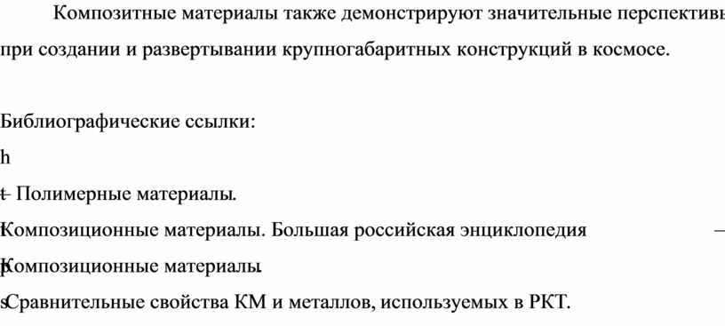 На основе вышеизложенного можно заключить, что внедрение композитных материалов в конструкции изделий ракетно-космической техники является крайне важным и актуальным. Современные композиты обеспечивают снижение массы, повышение прочности, жесткости, а также химической и тепловой стойкости конструкций. Это, в свою очередь, позволяет увеличить массу полезного груза, который может выводить ракета-носитель (РН). Композитные материалы также демонстрируют значительные перспективы при создании и развертывании крупногабаритных конструкций в космосе.